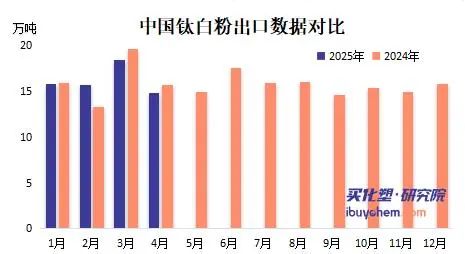 反倾销措施导致我国钛白粉出口量持续下滑。从2025年钛白粉出口数据来看,1月出口量为15.84万吨,而4月已下滑至14.8万吨。2025年1-4月,中国钛白粉累计出口量为64.89万吨,同比增长0.3%,但增速明显放缓。4月出口量仅为14.8万吨,低于2024年的月均出口量(15.85万吨)。