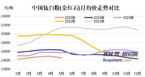 尽管面对欧盟、巴西和印度的反倾销措施,中国钛企积极开拓非洲、东南亚等新兴市场,但在终端需求持续疲软的背景下,随着传统需求淡季临近,内需市场动能不足,海外出口下滑将进一步加剧国内存量竞争。全球贸易环境的不确定性叠加内需增长乏力,钛白粉行业供需格局持续失衡,产品价格承压态势或将延续。据买化塑研究院监测数据,目前国内金红石型钛白粉价格已降至13200-14900元/吨,跌至近5年低点。
